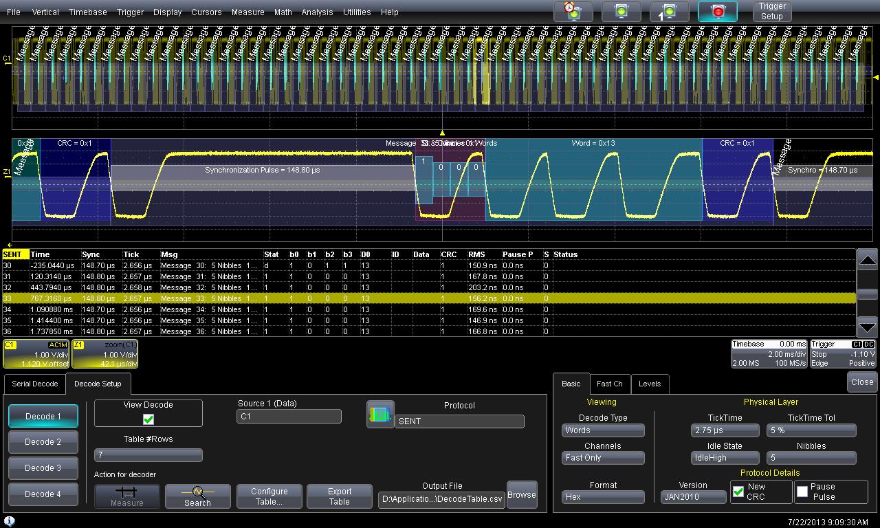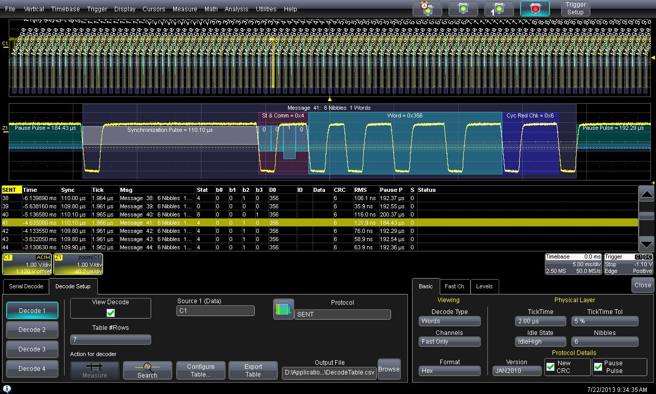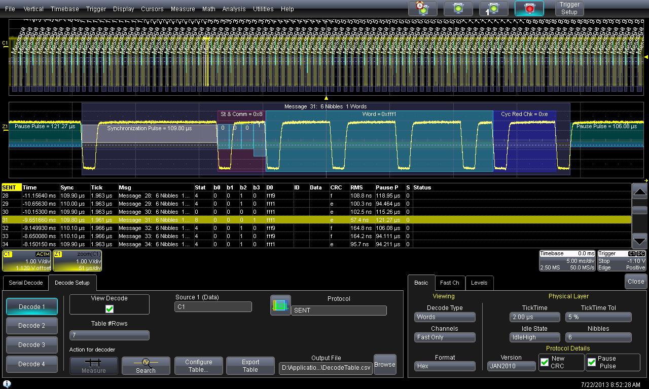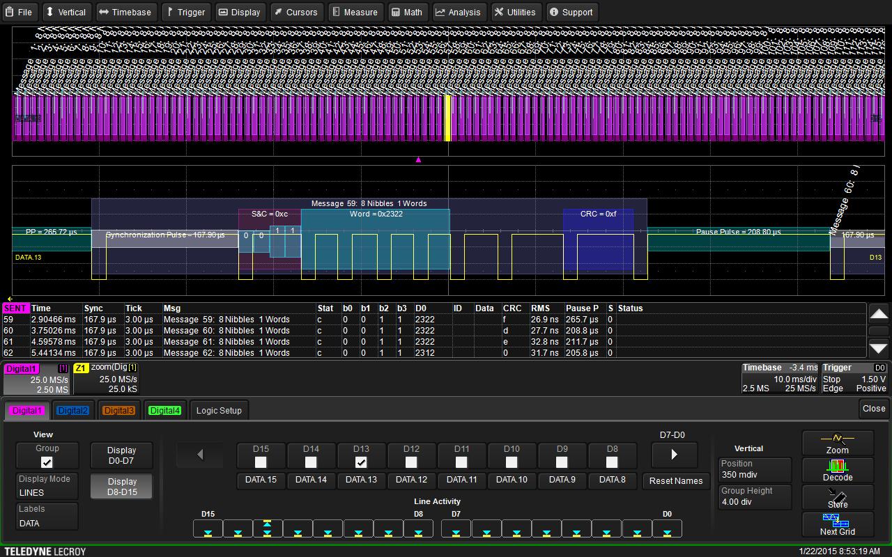 This view shows a SENT signal decoded using Digital1 and zoomed by Z1 onto Message 1 |