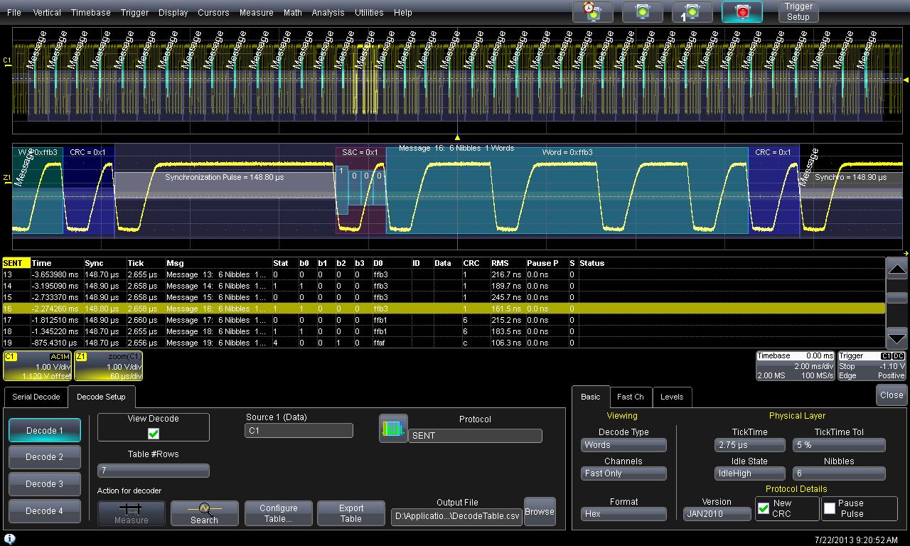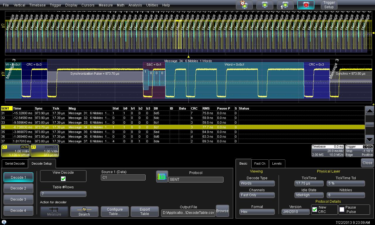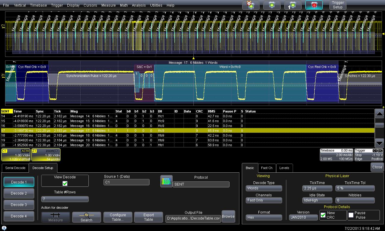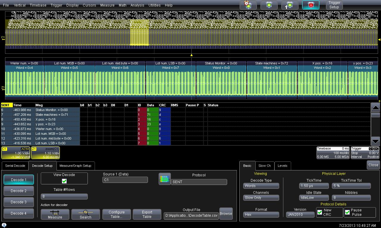 This example shows a special case of SENT decoding. The particularity of this signal is the similitude of length between Pause Pulse and Sync Pulse. It is easy to decode correctly by tightening the TickTime Tolerance. By downloading the TRC file it is possible to load it into a memory and verify the decoding. Note that the default TickTime Tolerance is set to 25%, which accomodates most signals. |