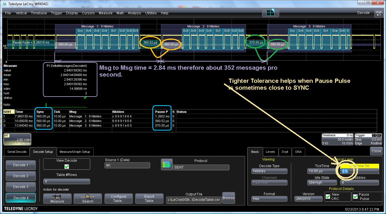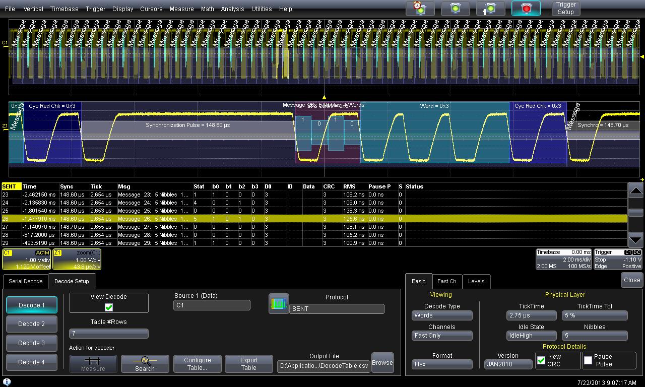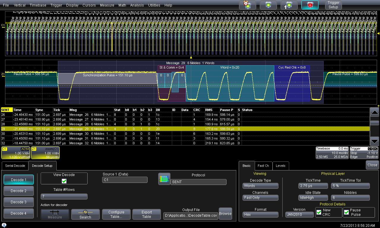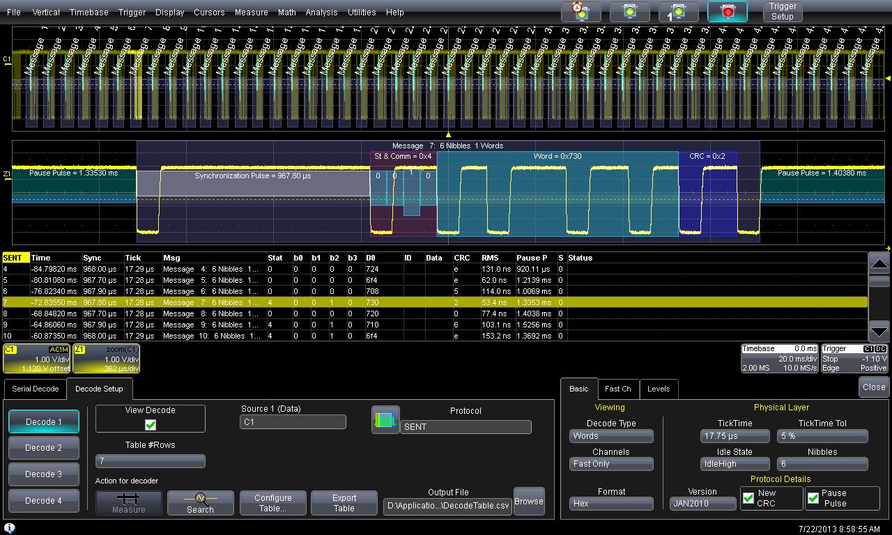 This example shows a special case of SENT decoding. The particularity of this signal is the similitude of length between Pause Pulse and Sync Pulse. It is easy to decode correctly by tightening the TickTime Tolerance. By downloading the TRC file it is possible to load it into a memory and verify the decoding. Note that the default TickTime Tolerance is set to 25%, which accomodates most signals. |