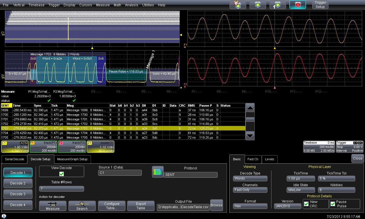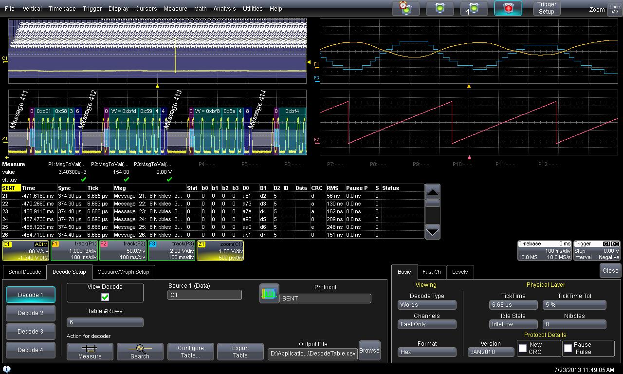 | 13 | Multiple SENT decoding on Pressure Sensors | Live experiment showing 4 pressure curves in paralell. The processing completely parallelizes the 4 decoders, the 4 MessageToValue and the 4 Trends monitoring the 4 MessageToValue. Using this method a sensors could be tested simultaneously, either using the osciloscope based Pass-Fail system or interrogating the oscilloscpe from a test PC. |