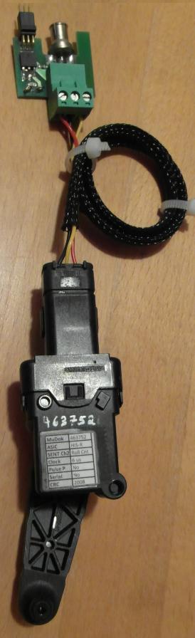 This is an example of the Hella Angle sensor embedded into a device. The sensor is connected via 3 wires to the LAH 102 evaluation board. As soon as the voltage regulator starts up, the sensor gets powered and reacts by starting to broadcast data. As shown on the picture the LAH102 can also accommodate a 3 pin connector receiving the wires from the device. Each case study contains: ** 1 TRC file with the raw data, ** 1 JPG file with image of decoded trace and main settings of SENT decoder, ** 1 JPG file (optional) with image of the Slow Channel decode ** 1 TXT file with the Decoder 1 setting in panel form suitable for injection into the scope. The file extension can be changed to LSS for convenience. |